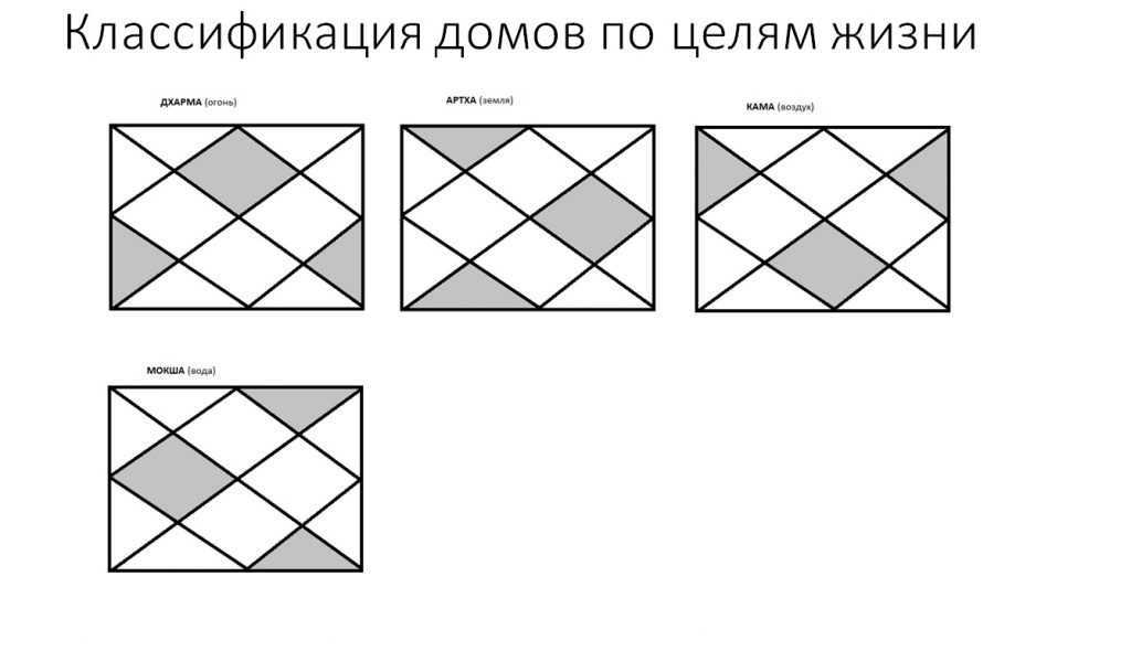 ► Вторая группа: дома дхармы, артхи, камы, мокши. В этой группе дома уподобляются элементам знаков: огненных (им уподобляются дома дхармы), земных (дома артхи), воздушных (дома камы), водных (дома мокши).
