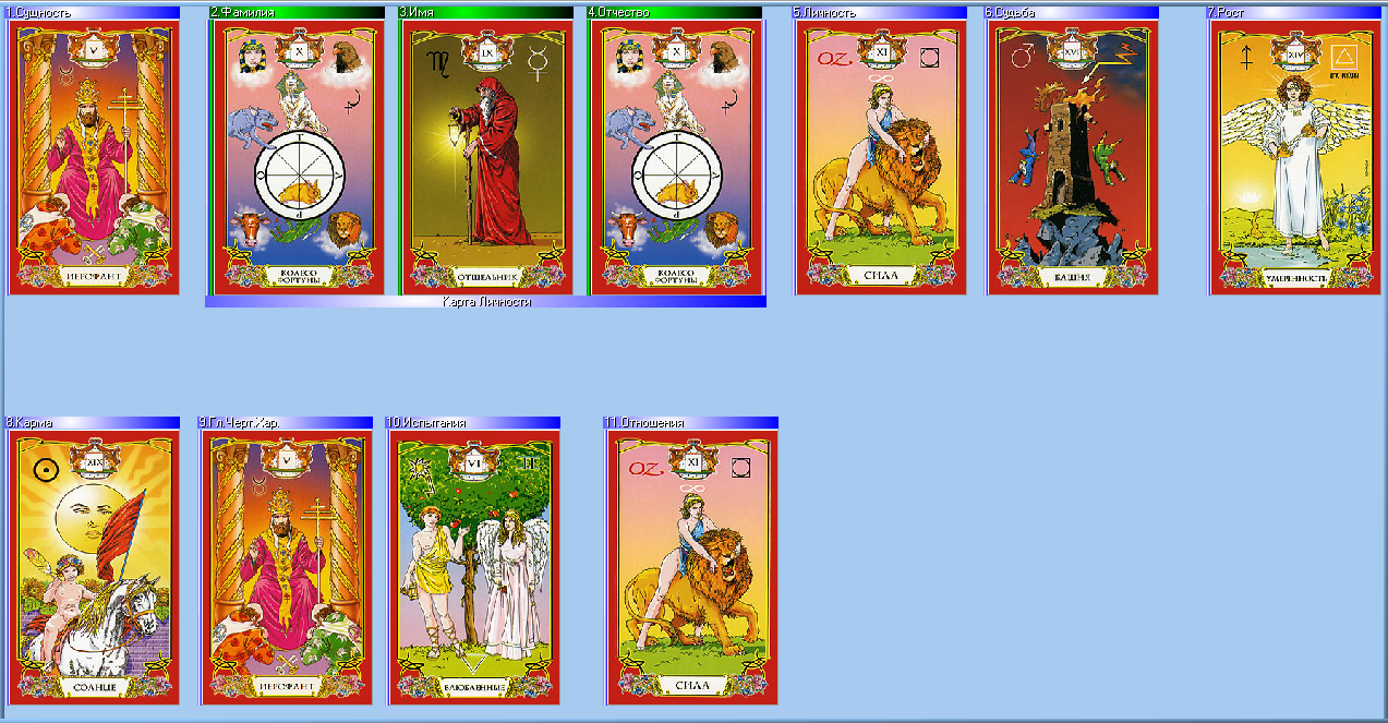 | 8 | Правосудие | Стабильность, уравновешенность, склонность к жизни по правилам | Предвзятость, недоверчивость, кармическое отягощение |