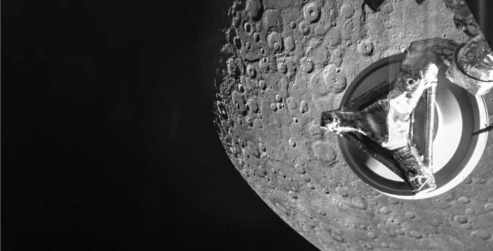 Фотография Меркурия, сделанная 23 июня 2022 г. во время пролета европейско-японской автоматической межпланетной станции BepiColombo. Фото сделано в 09:51:07 UTC с помощью камеры Monitoring Camera 3 на перелётном модуле MTM, когда станция находилась в 1406 км от поверхности планеты. Север находится вверху (с) ESA/BepiColombo/MTM, CC BY-SA 3.0 IGO