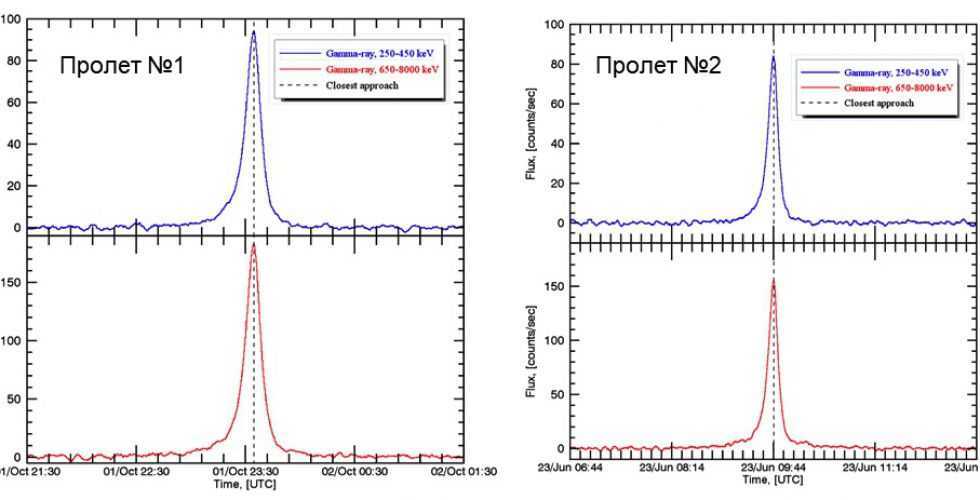 Потоки мягких (синий профиль) и жестких (красный профиль) гамма-лучей от поверхности Меркурия, измеренные прибором МГНС во время первого (левый график) и второго (правый график) пролетов аппарата «БепиКоломбо» над планетой