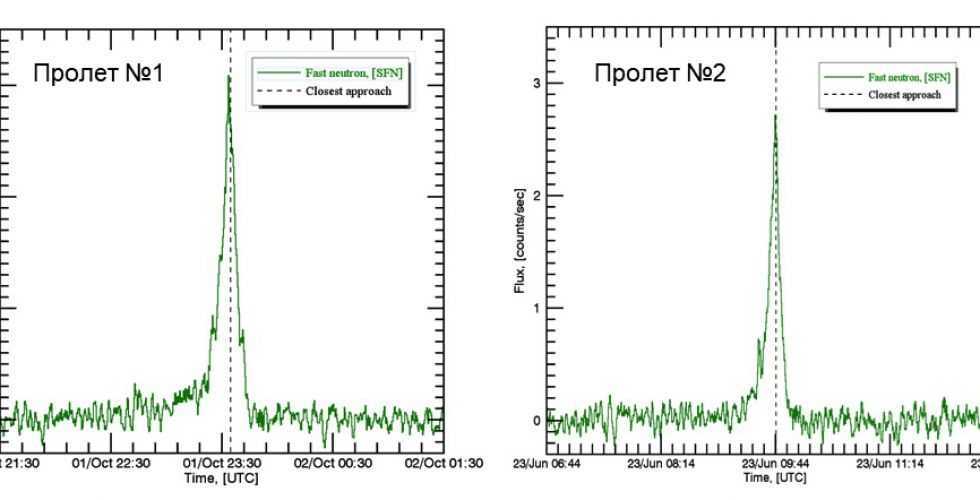 Потоки энергичных нейтронов от поверхности Меркурия, измеренные прибором МГНС во время первого (левый график) и второго (правый график) пролетов аппарата «БепиКоломбо» над планетой