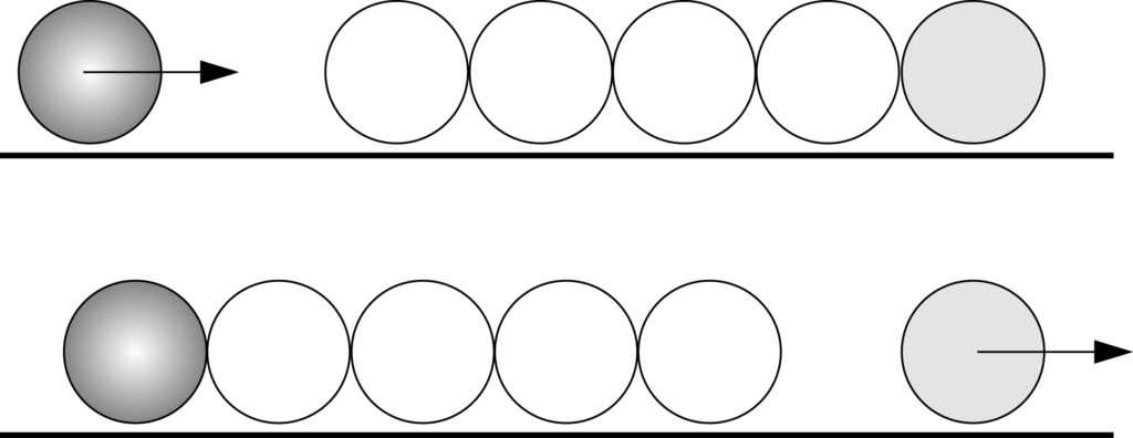 Возьмем несколько бильярдных шаров и положим их прямой линией на бильярдном столе так, чтобы они касались друг друга. Затем возьмем еще шар и покатим его так, чтобы он ударил в шар, лежащий на конце ряда. Тогда каждый из шаров в ряду будет попеременно сжиматься и производить давление на следующий за ним, в результате чего шар, находящийся на другом конце ряда, отскочит от него.
