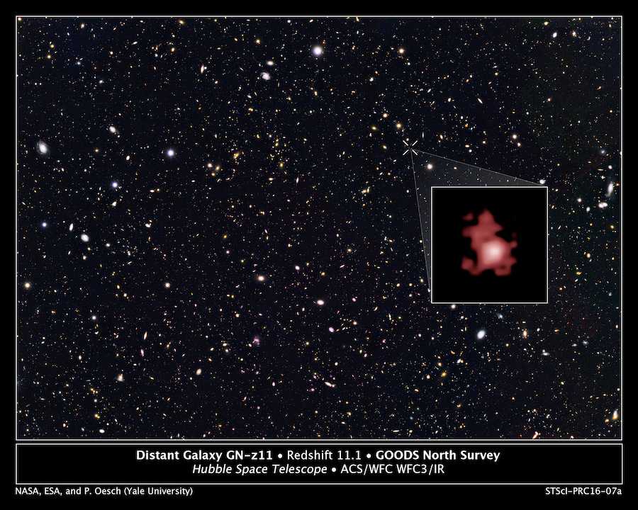 Галактика GN-z11, показанная на вставке, видна в прошлом на 13,4 млрд лет, всего через 400 млн лет после Большого взрыва, когда возраст Вселенной составлял всего 3% от ее нынешнего возраста. Учитывая расширение Вселенной, сейчас на деле она находится в 32 млрд световых лет от нас