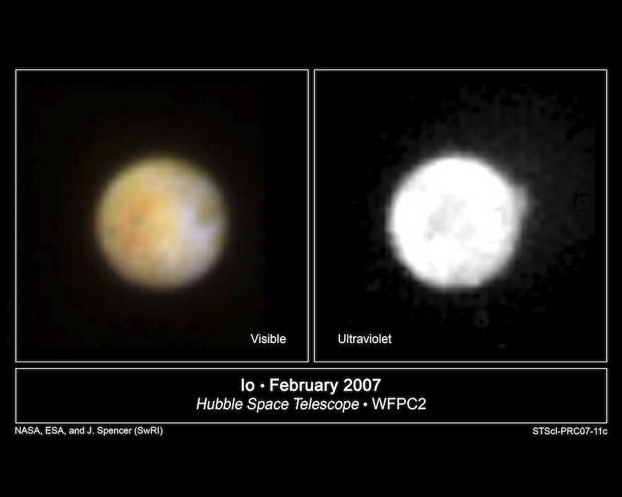Изображения сделаны 14 февраля 2007 года. На левом видны оранжевые овальные отложения серы вокруг вулкана Пеле. На правом изображении виден большой шлейф, поднимающийся над поверхностью, недалеко от северного полюса