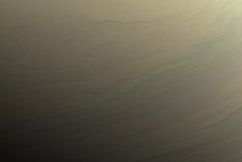 В конце августа 2017 года с высоты 1 126 540 километров над поверхностью планеты орбитальный аппарат «Кассини» сфотографировал едва заметные разноцветные полосы кружащихся облаков в северном полушарии Сатурна. Этот вид смотрит на терминатор – разделительную линию между ночью и днем – в левом нижнем углу. Солнце светит под малыми углами вдоль этой границы, местами подчеркивая вертикальную структуру облаков. На этом снимке виден некоторый вертикальный рельеф: «более высокие облака отбрасывают тени на облака, находящиеся на более низкой высоте,» – поясняет NASA. ()