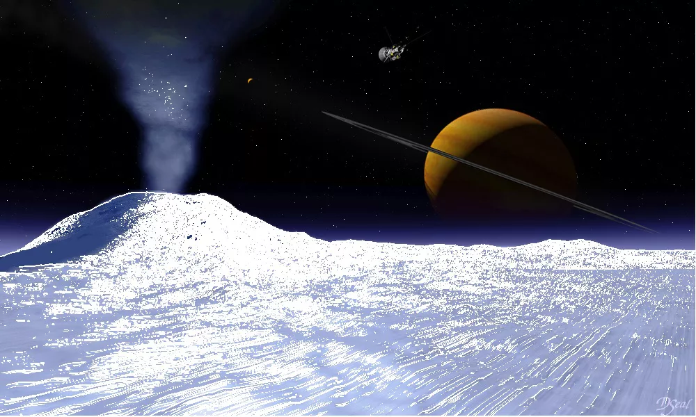 Это художественное изображение поверхности Энцелада, шестого по величине спутника Сатурна. Известный своим большим водяным льдом на поверхности, он примерно в 10 раз меньше Титана, крупнейшего спутника Сатурна. Кассини обнаружил богатый водой шлейф, исходящий из южного полярного региона Луны. Известно, что он чрезвычайно геологически активен.