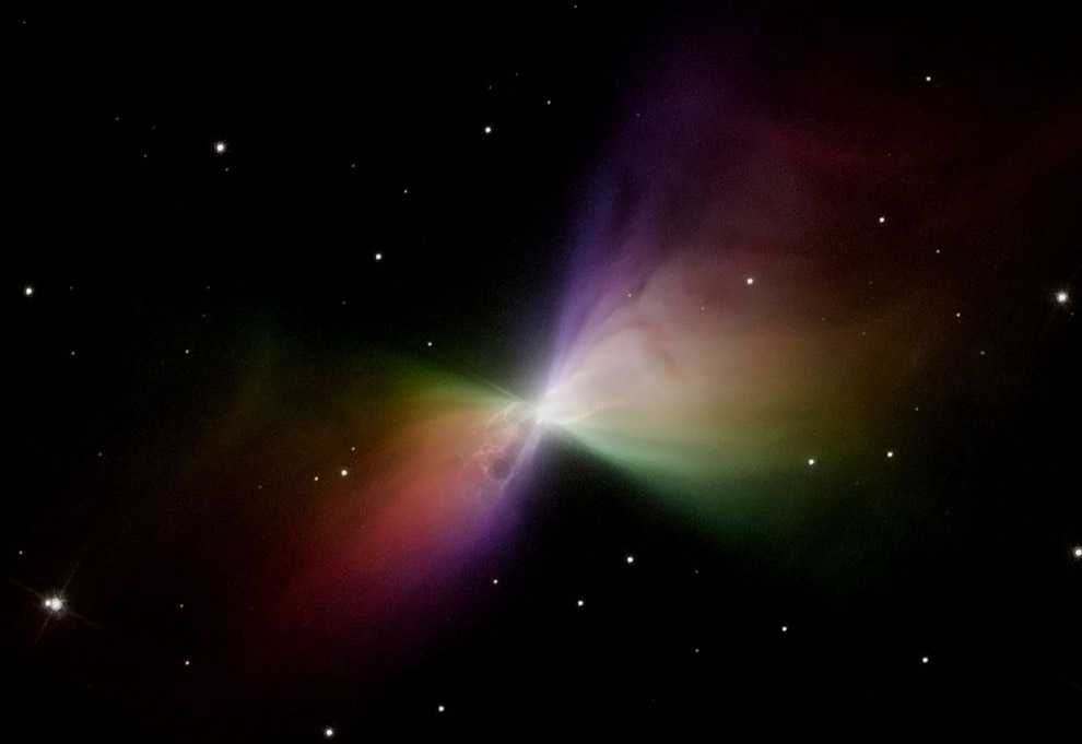 Туманность «Бумеранг» состоит из двух почти симметричных частей. Длина одной части — около одного светового года. Для сравнения: расстояние от нас до ближайшей звездной системы — Альфа Центавра, — всего лишь четыре световых года. (NASA, ESA and The Hubble Heritage Team STScI/AURA)