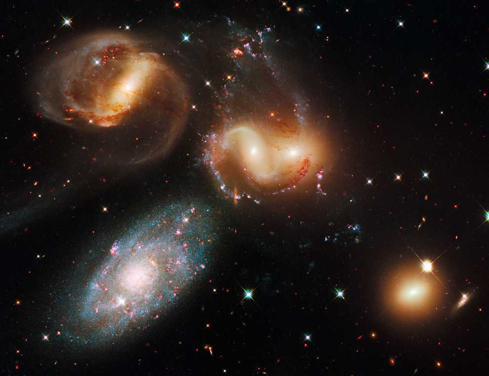 «Квинтет Стефана» — группа из пяти галактик. Поздние исследования показали, что название неверное, потому что одна из галактик расположена в семь раз ближе к Земле, чем остальные члены группы. Фото сделано «Хабблом» в 2009 году. (NASA, ESA, and the Hubble SM4 ERO Team)