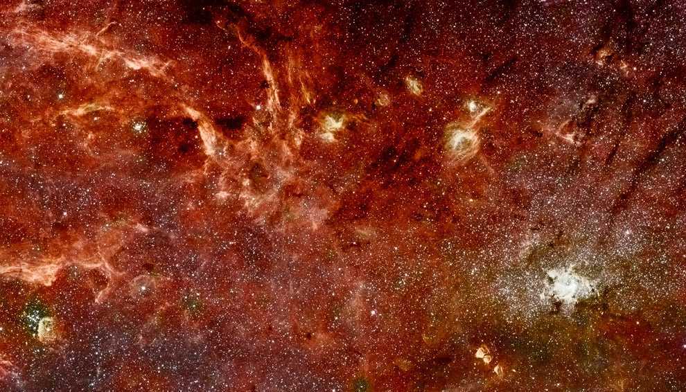 Изображение центра нашей галактики, сделанное в инфракрасном диапазоне. (NASA, ESA, Q.D. Wang (UMass, Amherst), JPL, and S. Stolovy (Spitzer Science Center/Caltech))