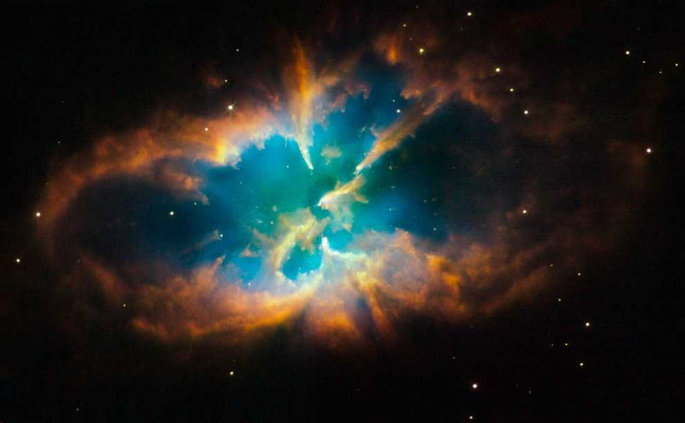 Туманность NGC 2818. Это изображение, полученное от «Хаббла», было им сдеано в ноябре 2008 года. Цвета на фотографии представляет собой диапазон газовых выбросов: красный цвет — азот, зеленый — водород и синий представляет кислород. (NASA, ESA, and the Hubble Heritage Team, STScI/AURA)