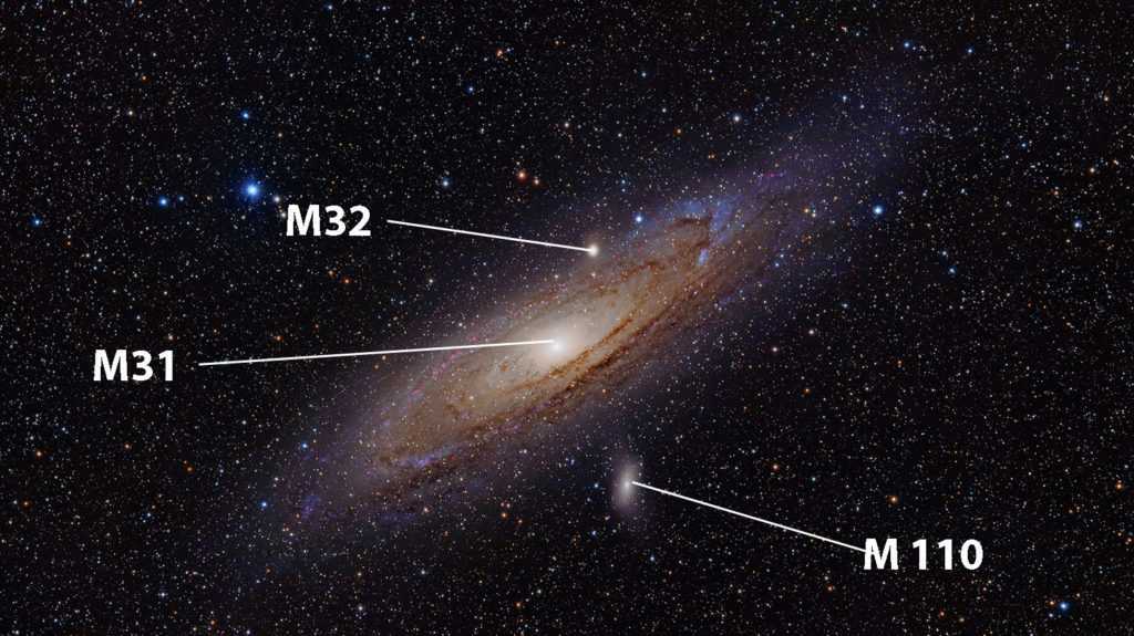 Вокруг массивной галактики обращаются несколько спутников. Это карликовые галактики, содержащие в себе всего по несколько миллиардов звёзд. На всех фотографиях Андромеды хорошо заметны две из них – М32 и М110.