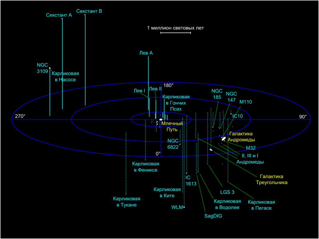 М32 и сама, скорее всего, ещё недавно была спиральной галактикой, но властная соседка своими приливными силами подавила процессы образования спиральных рукавов. Эти же приливные силы стимулируют обмен звёздами и с М110. При помощи телескопа CFHT, который удобно устроился на Гавайях, были обнаружены несколько галактик. Они все карликовые и обращаются в одной плоскости вокруг галактики Андромеда.
