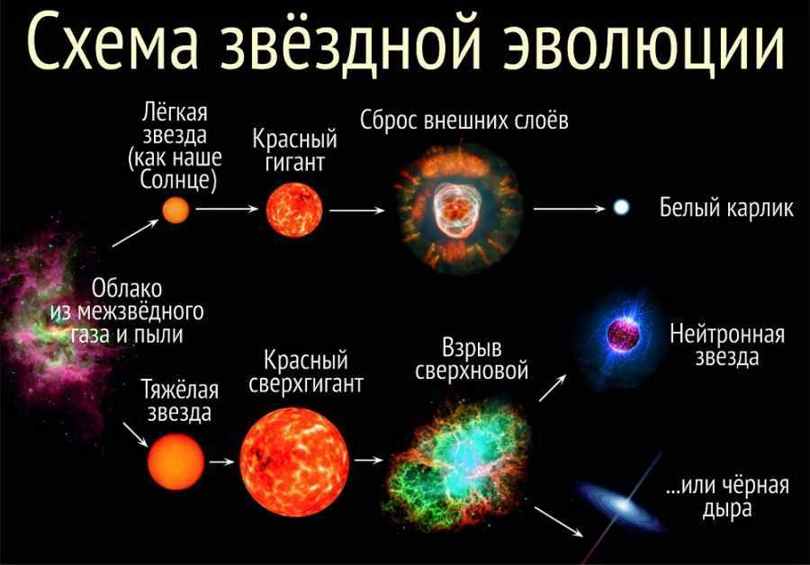 Начнем с рождения звезды. Представьте себе огромное облако холодного молекулярного газа, которое может спокойно существовать во Вселенной без всяких изменений. Но вдруг недалеко от него взрывается сверхновая или же оно наталкивается на другое облако. Из-за такого толчка активируется процесс разрушения. Оно делится на небольшие части, каждая их которых втягивается в себя. Как вы уже поняли, все эти кучки готовятся стать звездами. Гравитация накаляет температуру, а сохраненный импульс поддерживает процесс вращения. Нижняя схема наглядно демонстрирует цикл звезд (жизнь, этапы развития, варианты трансформации и смерть небесного тела с фото).