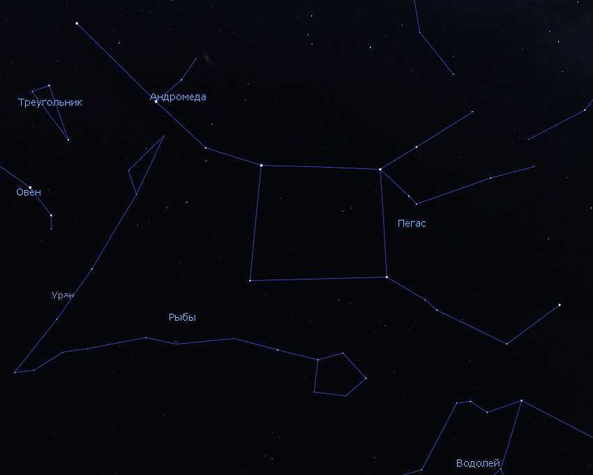 Чтобы найти Андромеду на небе, надо прежде всего отыскать четыре звезды, образующие в небе большой квадрат. Осенними вечерами этот квадрат находится высоко в небе на юге. Три звезды — правая верхняя и две нижних — принадлежат созвездию Пегаса, из-за чего эта фигура называется Большой Квадрат Пегаса. Это главный небесный ориентир на осеннем небе.