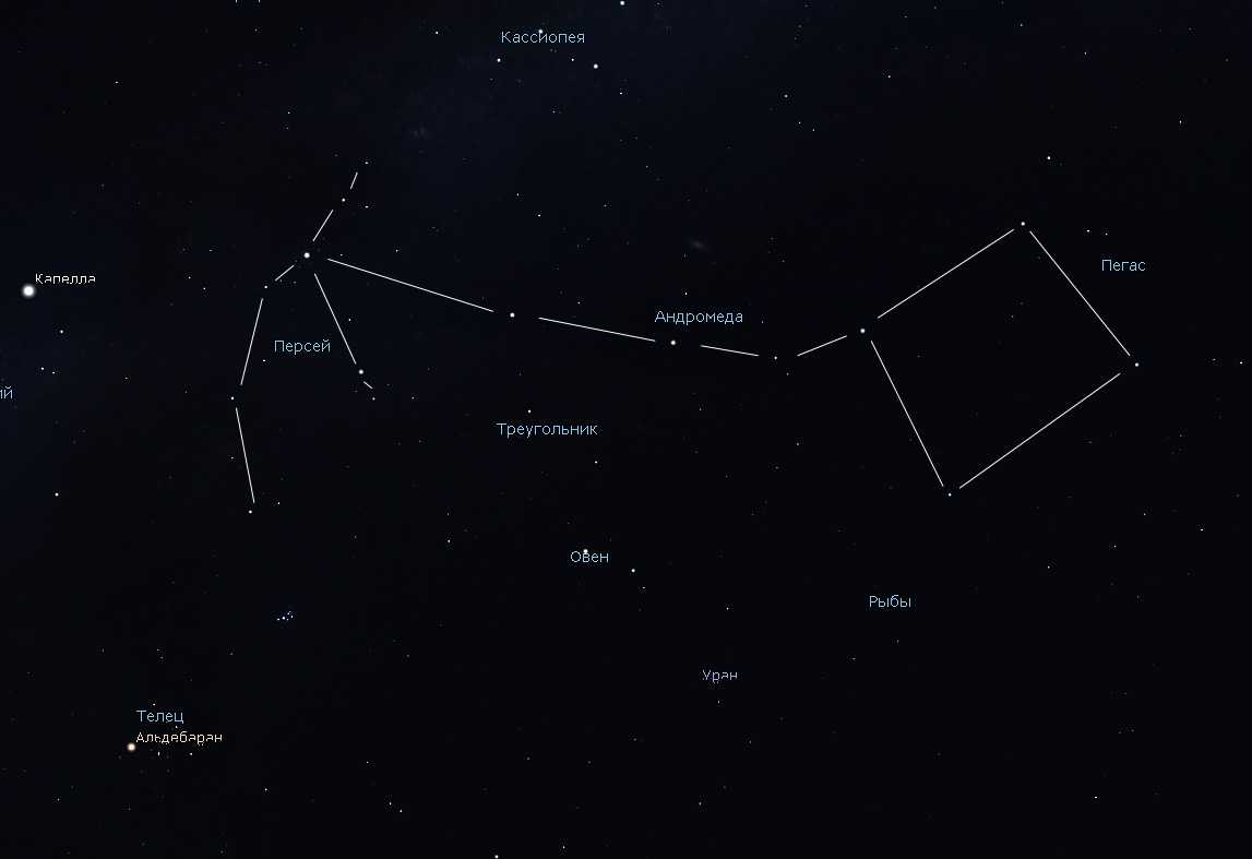 Созвездия Персей и Андромеда соседствуют – Андромеда находится справа, еще правее выделяется Большой Квадрат Пегаса. Слева находится созвездие Возничего с яркой Капеллой – одной из ярчайших звёзд земного неба.