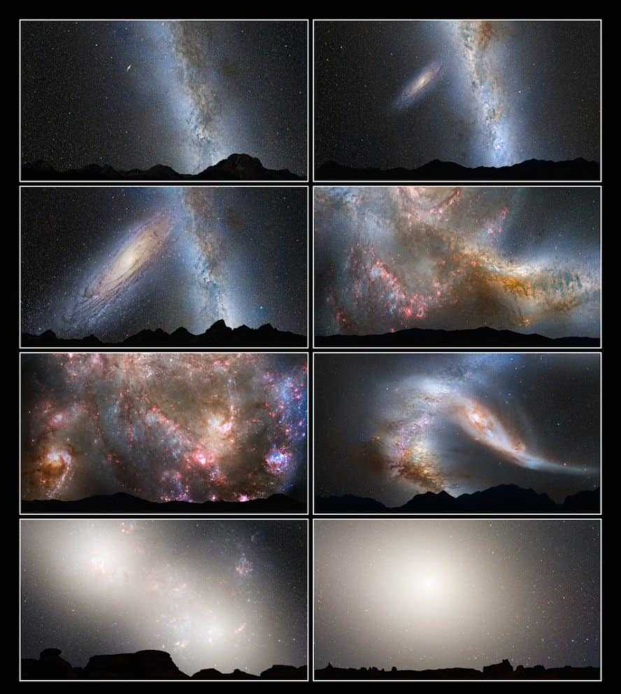 Совсем недавно ученым стало понятно, что соседняя галактика Андромеда, превосходящая Млечный Путь по массивности, приближается к нашей системе со скоростью от 100 до 140 км в секунду. Сближение двух спиральных космических объектов происходит достаточно быстро, по масштабам Вселенной. Если скорость останется на таких же показателях, то перспектива столкновения отстоит от современности примерно на 4,5 миллиарда лет. Увидеть звезды соседней галактики на небе планеты Земля без технических приспособлений станет возможным через 3 миллиарда лет.