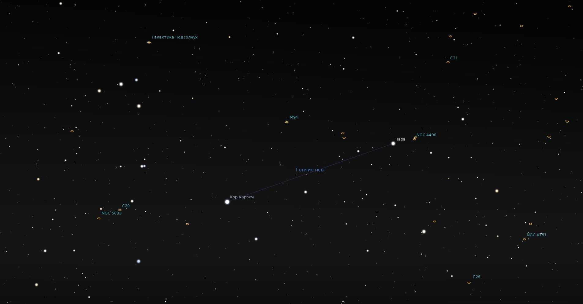 Созвездие Гончих Собак не отличается наличием слишком ярких звезд и имеет относительно небольшую площадь, но это не мешает находить его на бесконечном небе, разбросанном множеством разных созвездий. Все звёзды Гончих Собак идеально подходят под «ручку» ведра Большой Медведицы. Если вы представите свой палец как «небесный маркер» и проведете линию через звезду Дубхе и звезду Фад на юго-восток, то этот путь приведет вас к звезде Кор Кароли, которая является альфой Гончих. Ближе к востоку находится Волопас и его знаменитая звезда по имени Артур. Созвездие Гончих Собак расположено достаточно высоко над горизонтом и прекрасно просматривается на всей территории нашей страны.