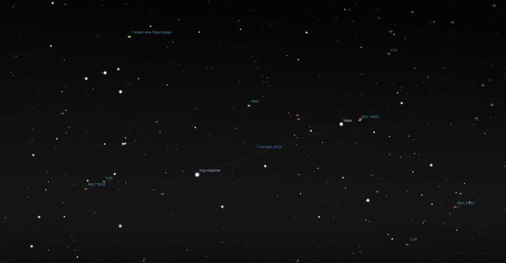По оценке учёных, здесь можно увидеть невооружённым глазом 57 звёзд. Давайте разберём главные из них. В первую очередь, Альфа или Сердце Карла представляет собой ярчайшую двойную систему. Имеет среднюю видимую величину 2,9. Состоит из светила главной последовательности (Альфа-1) и бело-голубой горячей звезды (Альфа-2). Причём вторая наиболее яркая. На втором месте стоит Бета — Хара, чьё имя означает дорогой или радость. Относится к субгигантам жёлто-белого цвета с яркостью 4,26. Интересно, что её называют двойником Солнца, потому как имеет с ним похожую массу, возраст и стадию эволюции. Затем следует Y Гончих Псов. Между прочим, это ярчайшая из редких углеродистых (J-класс) и красных звёзд. Помимо этого, это полурегулярный переменный объект с величиной 4,8-6,3. В созвездии означает превосходная. По оценке учёных, находится на заключительной стадии слияния гелия и углерода. То есть её масса быстро уменьшается, а окружающий диск растёт. В будущем светило станет белым карликом, внешние слои разрушатся, и в результате получится туманность.