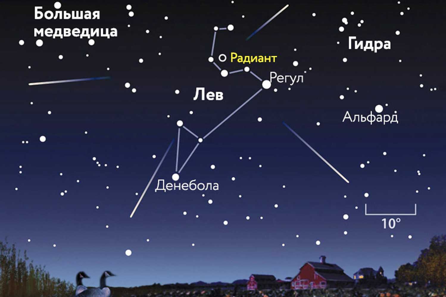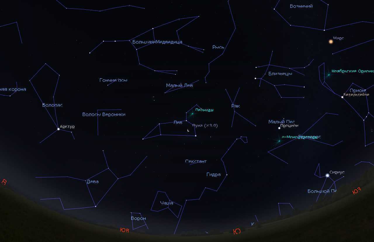 В созвездии Льва находится радиант Леонид (точка на небе, из которой вылетают метеоры). 18 ноября он будет располагаться немного выше Луны, в той части созвездия, которую называют «серпом».