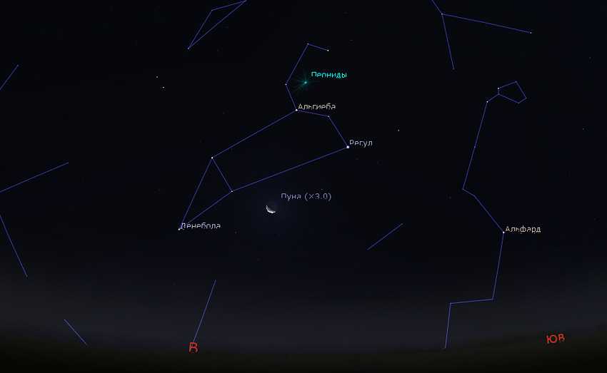 И хотя подсчитаны точные координаты источника (α = 152°, δ = +22°), все же лучше наблюдать область вокруг него. Конечно, рекомендуется вести наблюдения с возвышенности за пределами города. Также дайте минут 20 вашим глазам, чтобы они адаптировались к темноте и лучше замечали яркие объекты на небосводе.