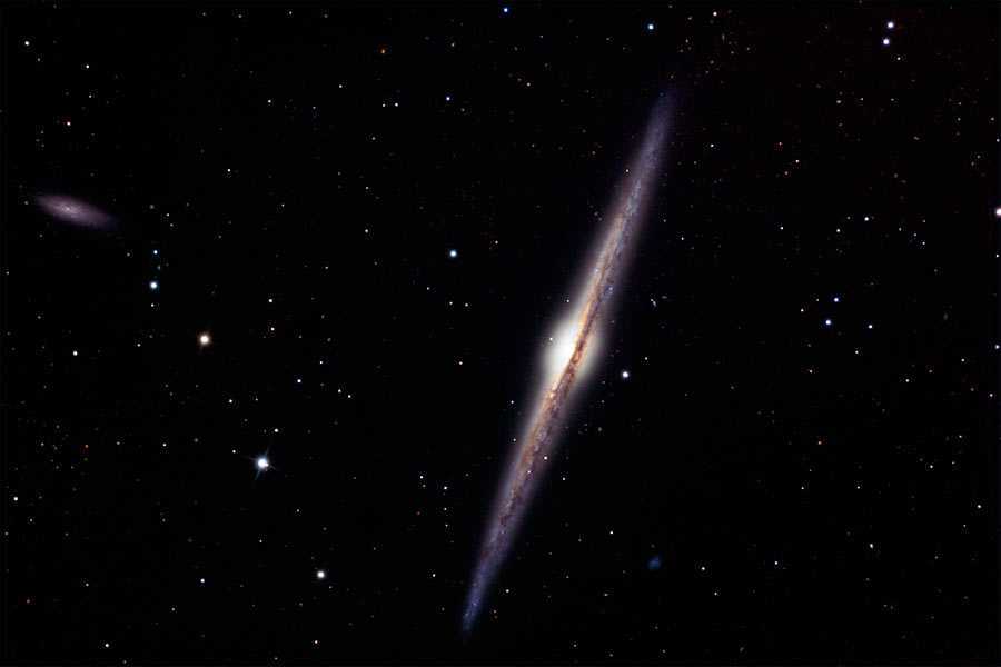 Спиральная галактика NGC 4565, вид сбоку. Очевидно, что если бы не вращение, она тоже скорее напоминала бы шар, чем «сплюснутую тарелку»