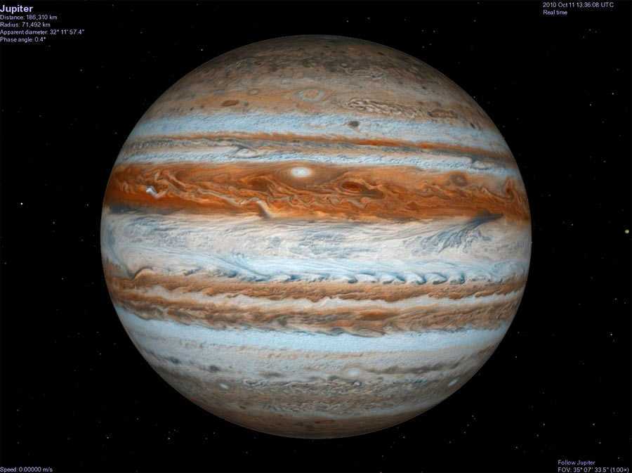 Форма Земли также лишь немного отличается от сферы, а вот диск Юпитера (эта планета рекордсмен не только по размерам, но и по скорости – полный оборот у неё занимает всего 10 часов!), если смотреть в телескоп, уже заметно сплюснут у полюсов.