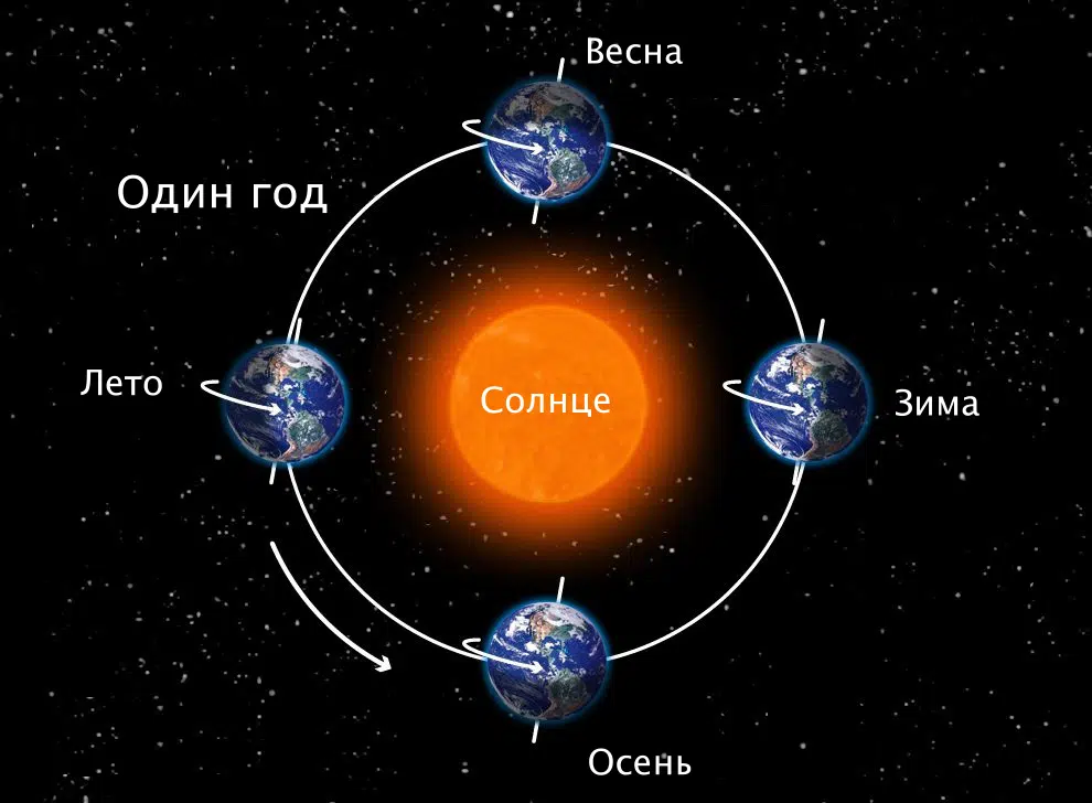 Один оборот вокруг Солнца Земля совершает за 365 суток 5 ч. 48 мин. и 46 сек. Каждые 4 года в календарь вводится дополнительный день.