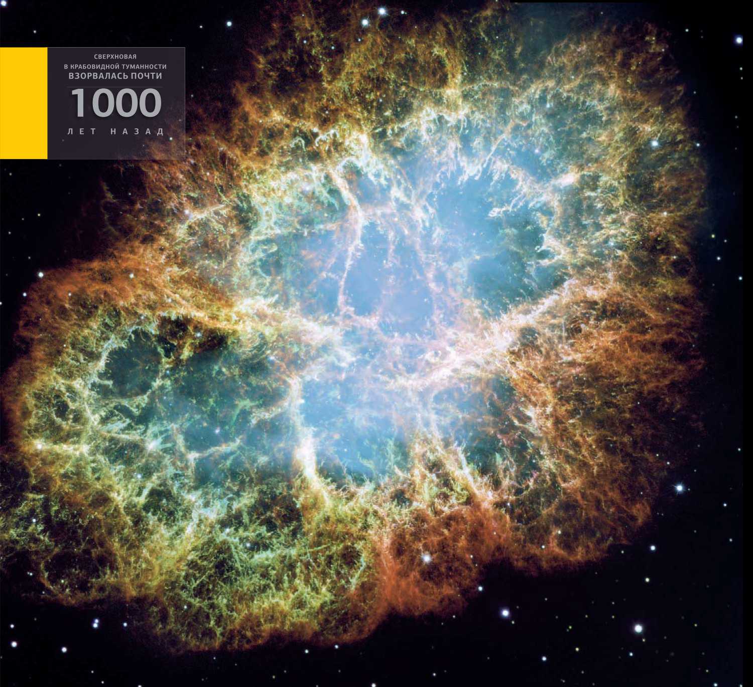 Крабовидная туманность — это остаток сверхновой, свет которой впервые был зарегистрирован японскими и китайскими астрономами в 1054 году. Ее остатки сейчас образуют газовое облако с диаметром 6 св. лет. Голубоватое свечение туманности обусловлено магнитным полем пережившего коллапс ядра взорвавшейся звезды быстро вращающейся нейтронной звезды в центре туманности.