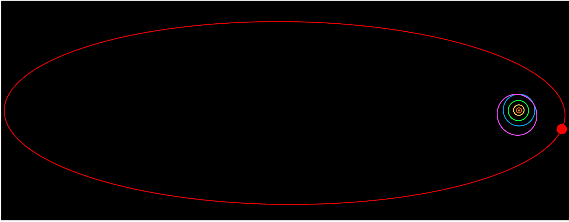 Орбита Седны (красная) в сравнении с орбитами Юпитера (оранжевая), Сатурна (жёлтая), Урана (зелёная), Нептуна (синяя) и Плутона (сиреневая)
