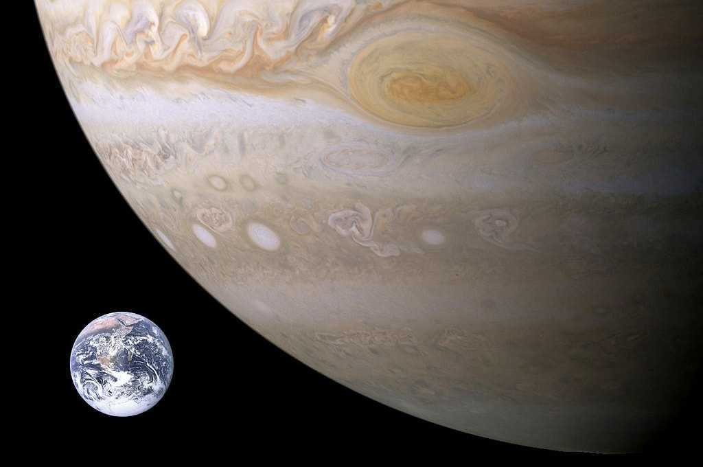 Юпитер по объему в 1300 раз больше Земли. Чтобы это было легче понять, следует привести следующее сравнение: если бы Землю удалось уменьшить до размеров горошины, то Юпитер по отношению к ней, имел бы размеры с баскетбольный мяч.