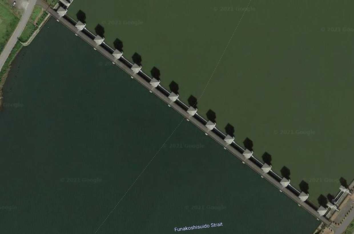 Огата на карте Земли, крупным планом со спутника и дамба, которая защищает пресные воды от высокого уровня море