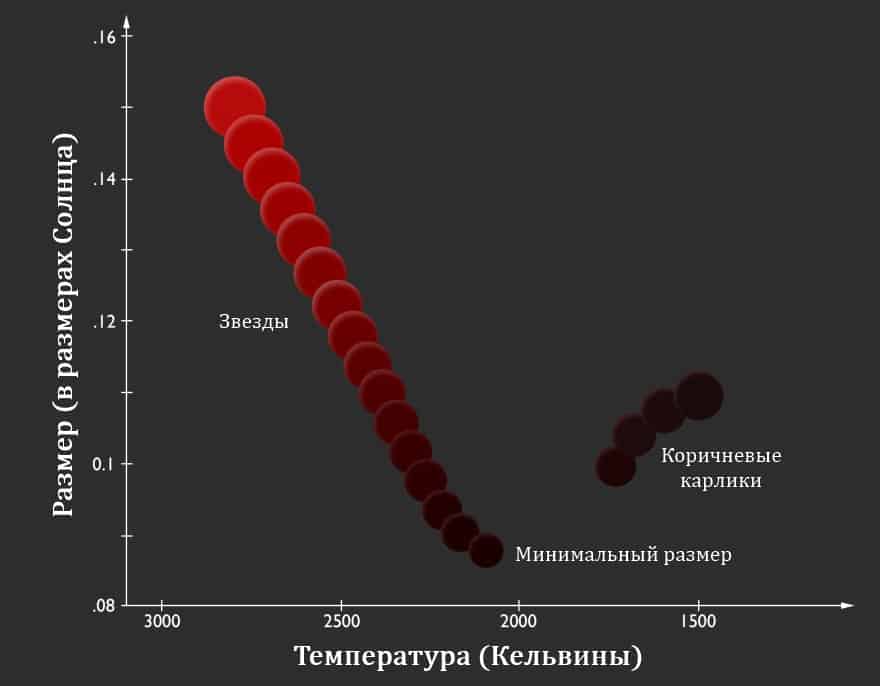Самые маленькие звезды — коричневые карлики, масса которых всего в 13 раз больше массы Юпитера. В отличие от Юпитера, коричневого карлика по праву можно назвать несостоявшейся звездой. У него достаточно массы, чтобы синтезировать дейтерий (изотоп водорода), но недостаточно массы, чтобы поддерживать настоящую реакцию синтеза, которая определяет звезду. Юпитер на порядок меньше массы, достаточной, чтобы стать коричневым карликом.