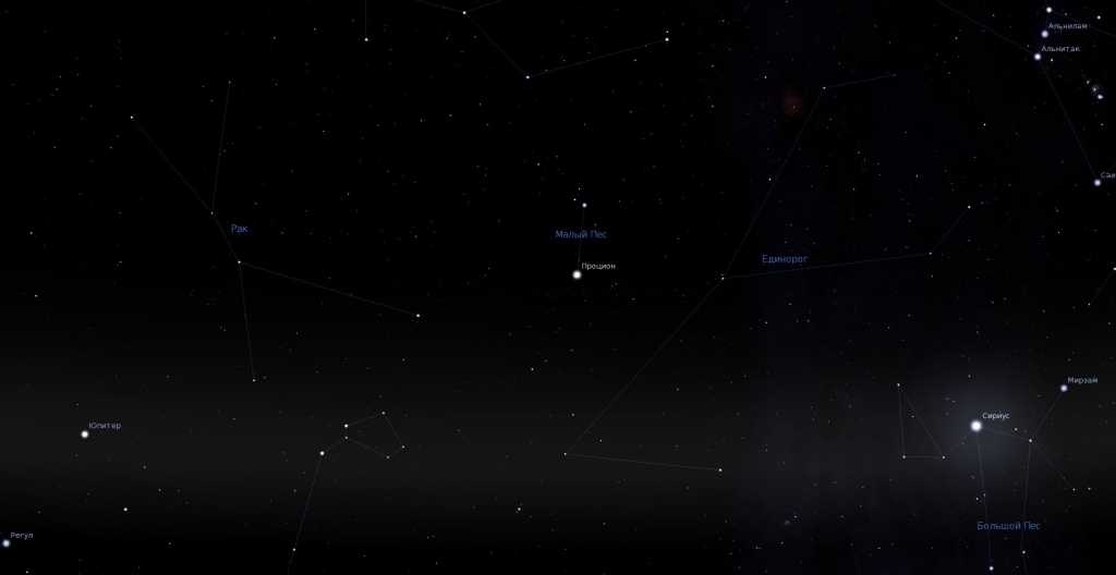 Созвездие Малого Пса экваториальное, то есть поднимается над горизонтом совсем не высоко. Пёс находится рядом с охотником Орионом. Необходимо стать лицом на юг. Отыскать глазами пояс Ориона и провести линию от нижней звезды пояса на восток.