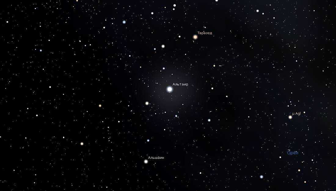 Альшаин (Бета Орла) – седьмая по яркости в Орле, но Иоганн Байер назначил ее Бетой Орла. Видимая величина – 3.71. Это субгигант G-типа, удаленный на 44,7 световых года.