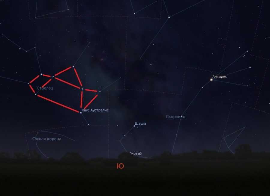 Созвездие Стрельца в средних широтах не поднимается высоко над горизонтом. Его видно только в южной части неба