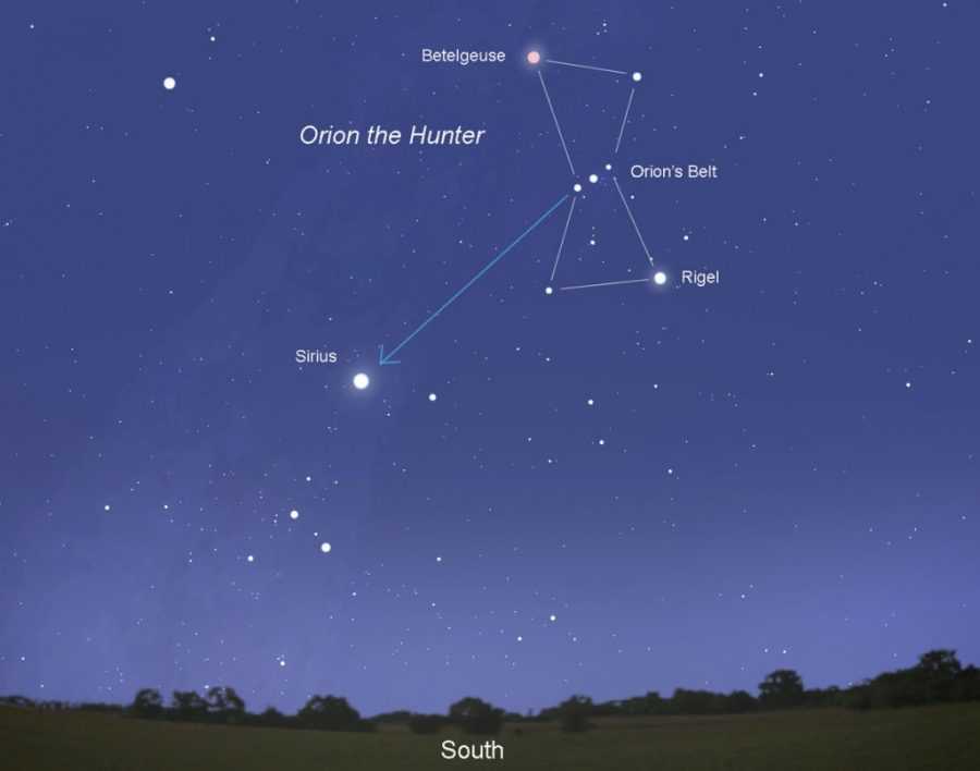 Без подсказки найти Сириус на небе можно по главному ориентиру — поясу Ориона. Если зрительно провести через него прямую линию, то одной стороной она «уткнется» в Альдебаран, а другой покажет на юго-восток, прямо по направлению к Сириусу. Спутать эти две значимые на небесной карте звезды невозможно, они разительно отличаются по степени свечения и уровню яркости.