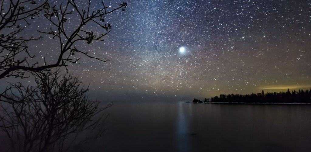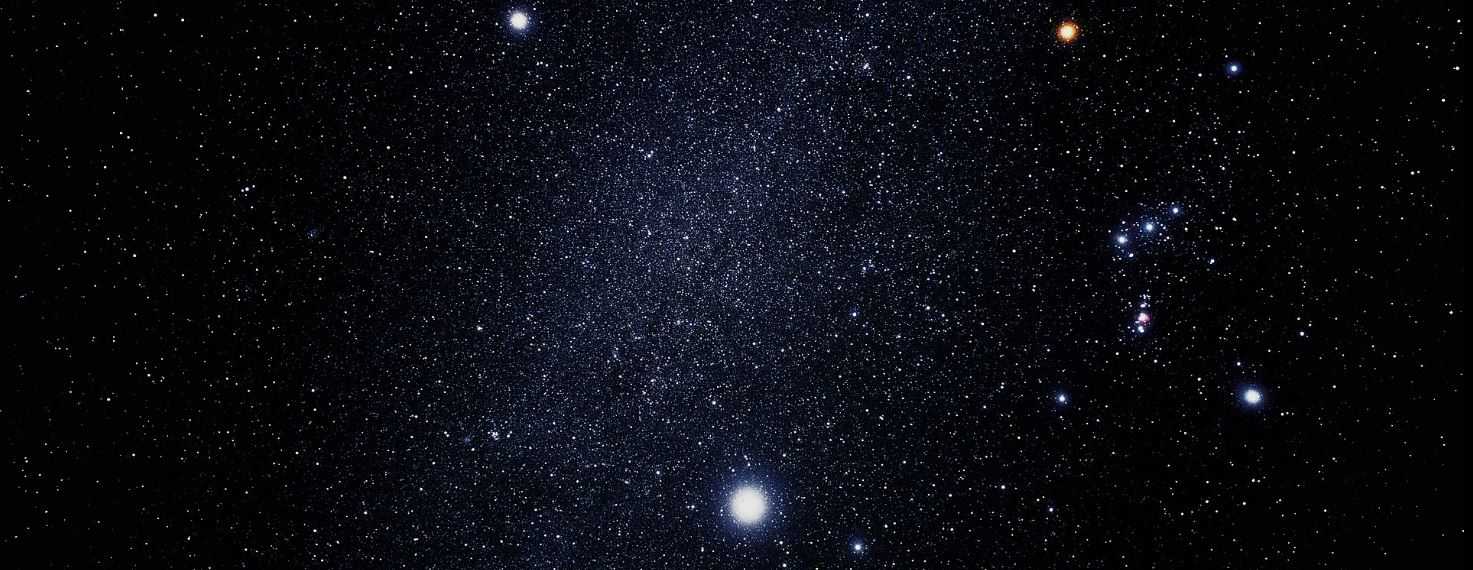 Сириус (самая яркая звезда), Процион (выше и левее) и созвездие Ориона (справа). Между Сириусом и Проционом хорошо виден участок Млечного Пути.